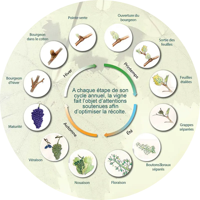 Le Cycle végétatif de la vigne est le cycle durant lequel la vigne vit : se réveille, débourre, fait des fruits, puis perd ses feuilles et enfin se rendort pour l’hiver. Ce cycle dure un an. La vigne se réveille de sa dormance au printemps puis se rendort à l’automne. En dormance, l’hiver, la vigne concentre sa sève dans ses racines. Les feuilles tombent, les bois s’endorment. Au réveil, au printemps, on observe la montée de sève : les pleurs. Puis les bourgeons se forment, c’est le débourrement, et ils donneront naissance aux fruits, la grappe.